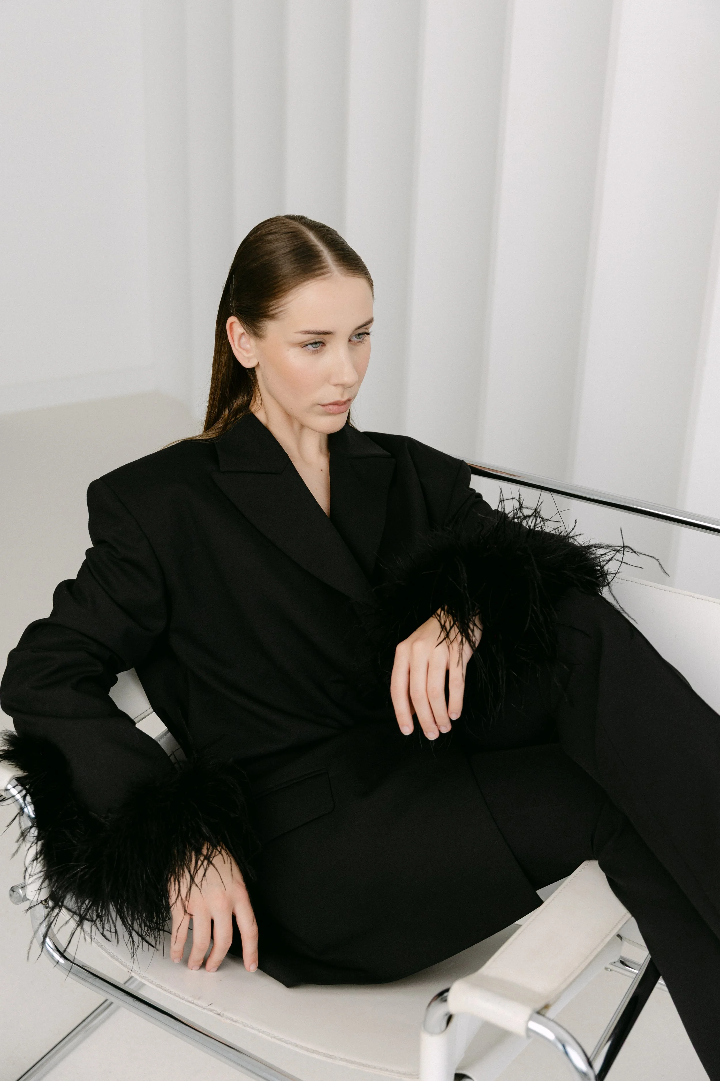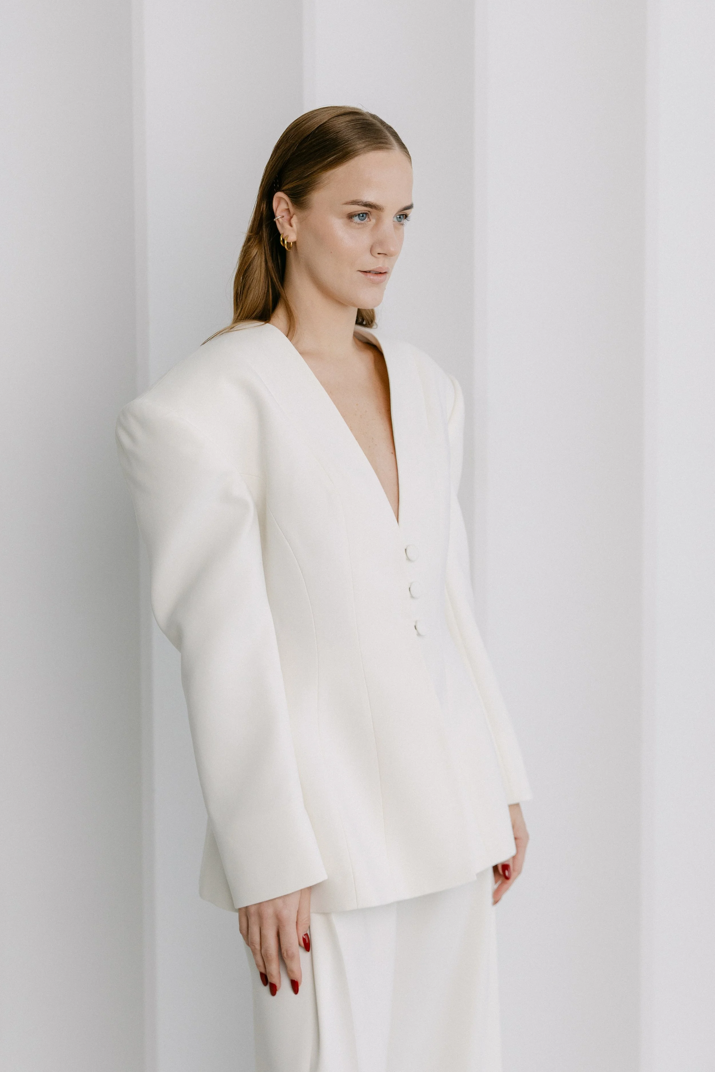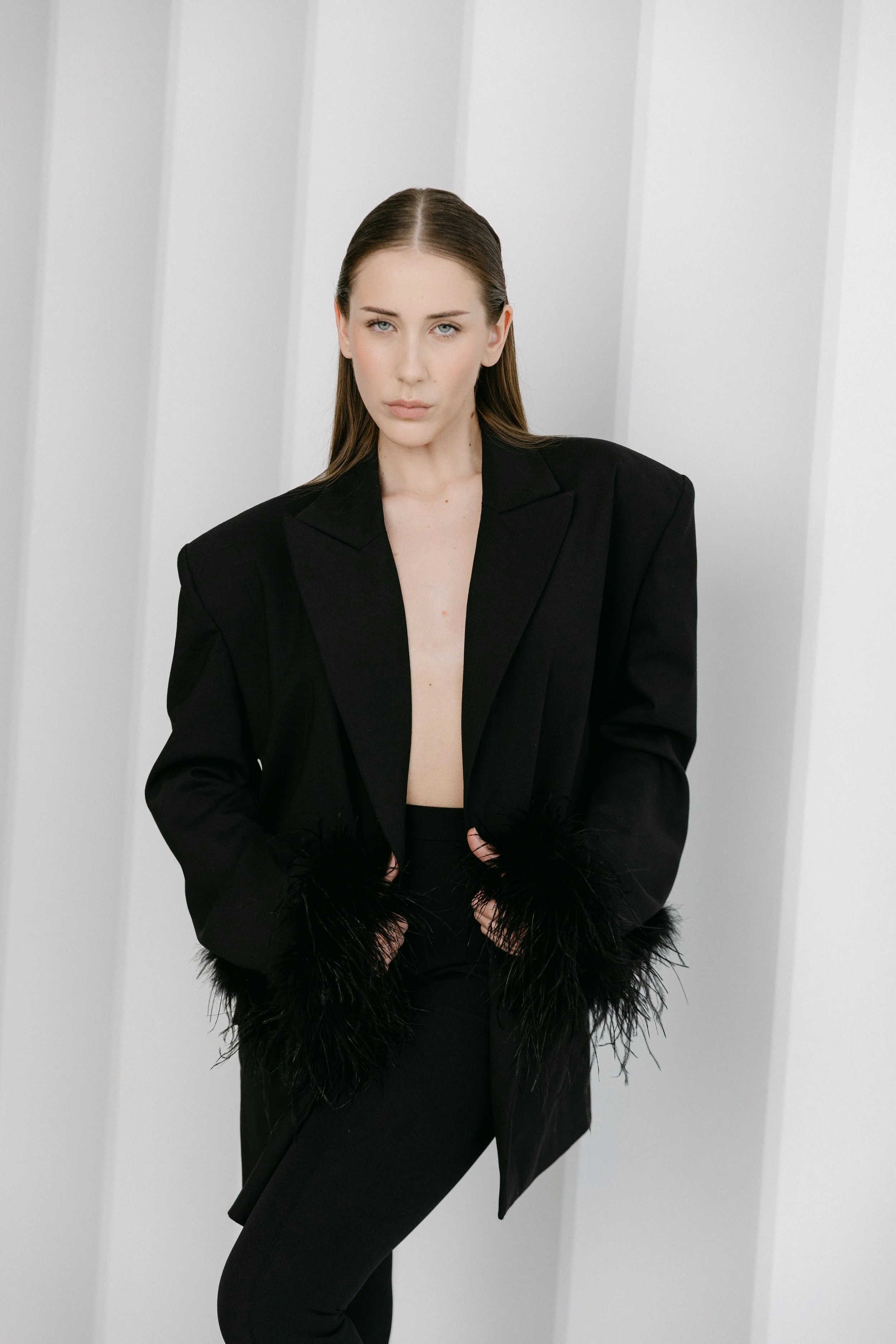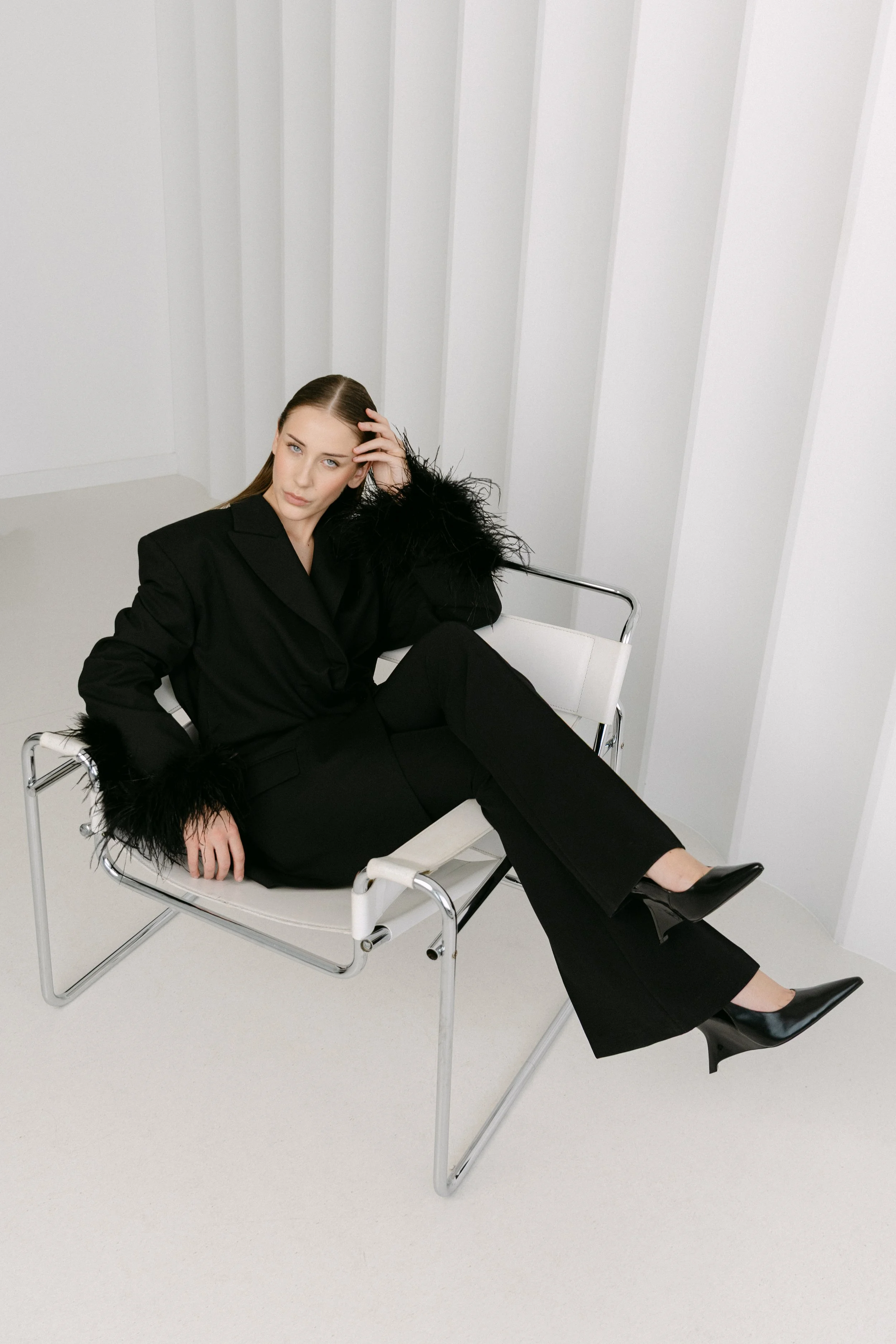 Structured white suit €450.00 Black feather-trimmed suit €450.00 Wool-silk dress blazer €300.00 Leather blazer with structured shoulders €200.00 Black leather A-line skirt €95.00 Structured cotton shirt with metal details €160.00 Wool-silk corset with silver imitation buttons €180.00 Pleated skirt with belt detail €110.00 White draped top €95.00 Oversized white shirt €140.00 Elegant long sleeve top with padded shoulders €160.00 Oversized cashmere-wool blazer €350.00 Polo t-shirt with padded shoulders in black €80.00 Sculpted denim jacket in brown €200.00 Sculpted-shoulder open-back bodysuit in black €80.00 Asymmetric shirt dress €250.00 Denim jacket in black with contrasting leather collar €200.00 A line denim skirt in brown €90.00 Leather shorts in black €130.00 Hand-knitted mohair cardigan €250.00 Hand knitted open-back mohair-silk sweater €250.00 Tote bag in black fure. €95.00 Tie in grey €30.00