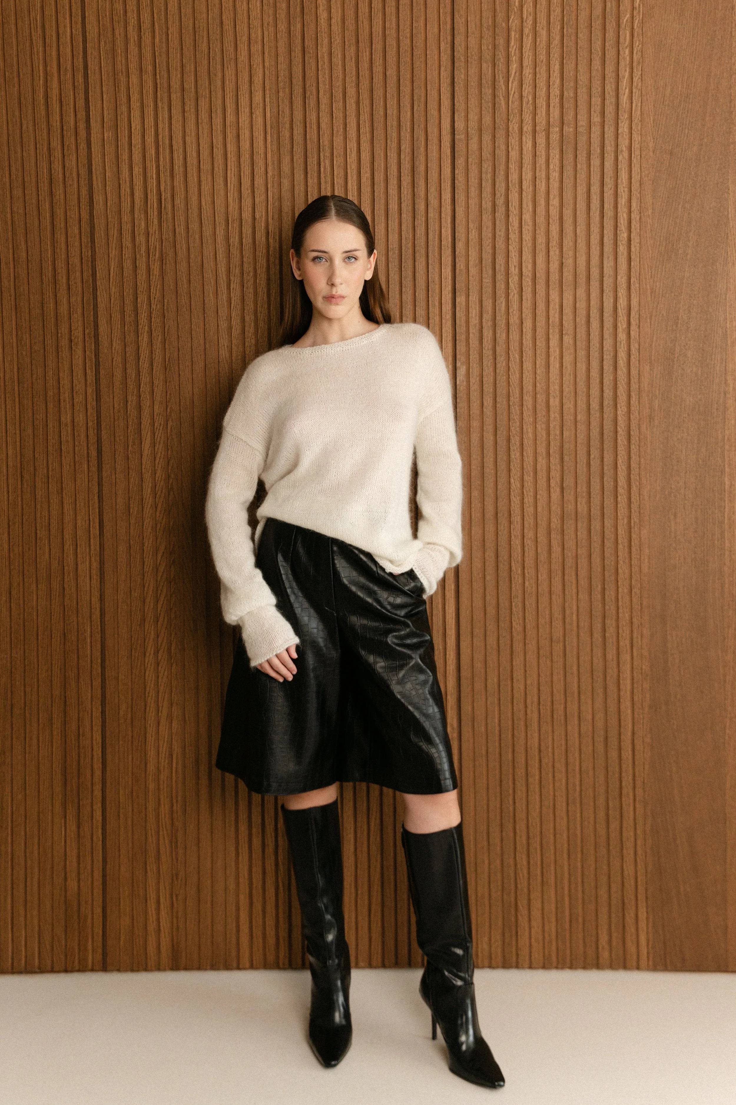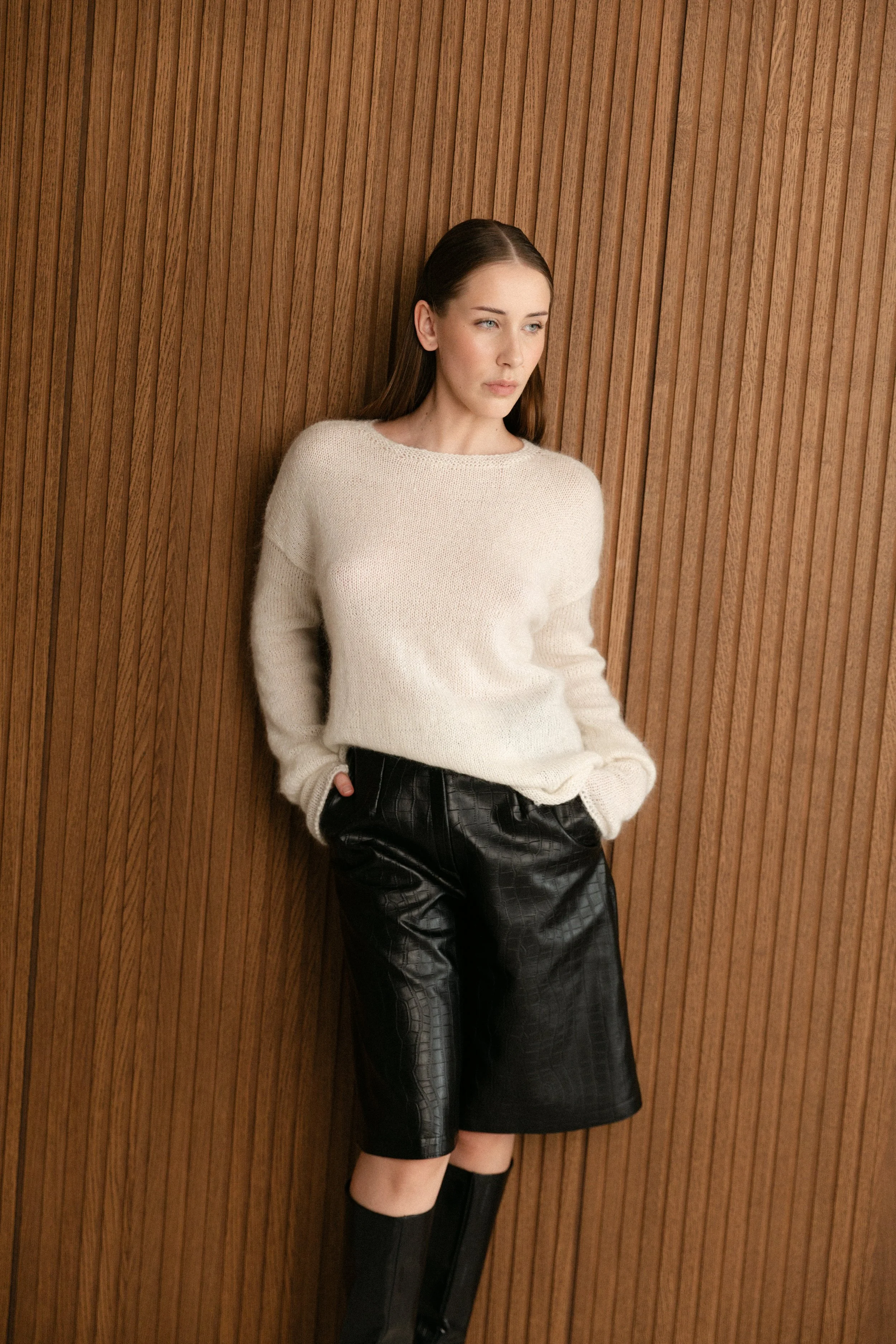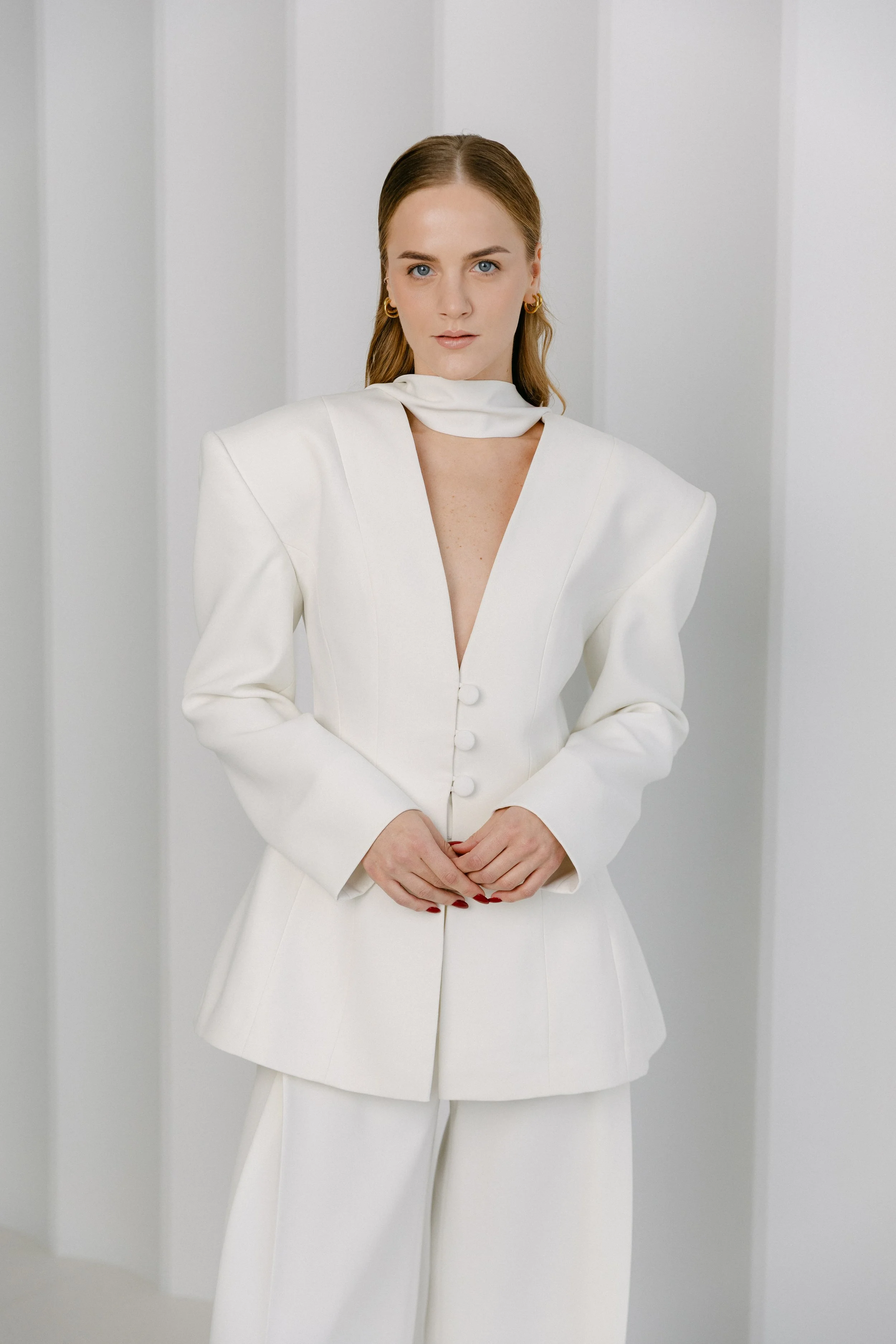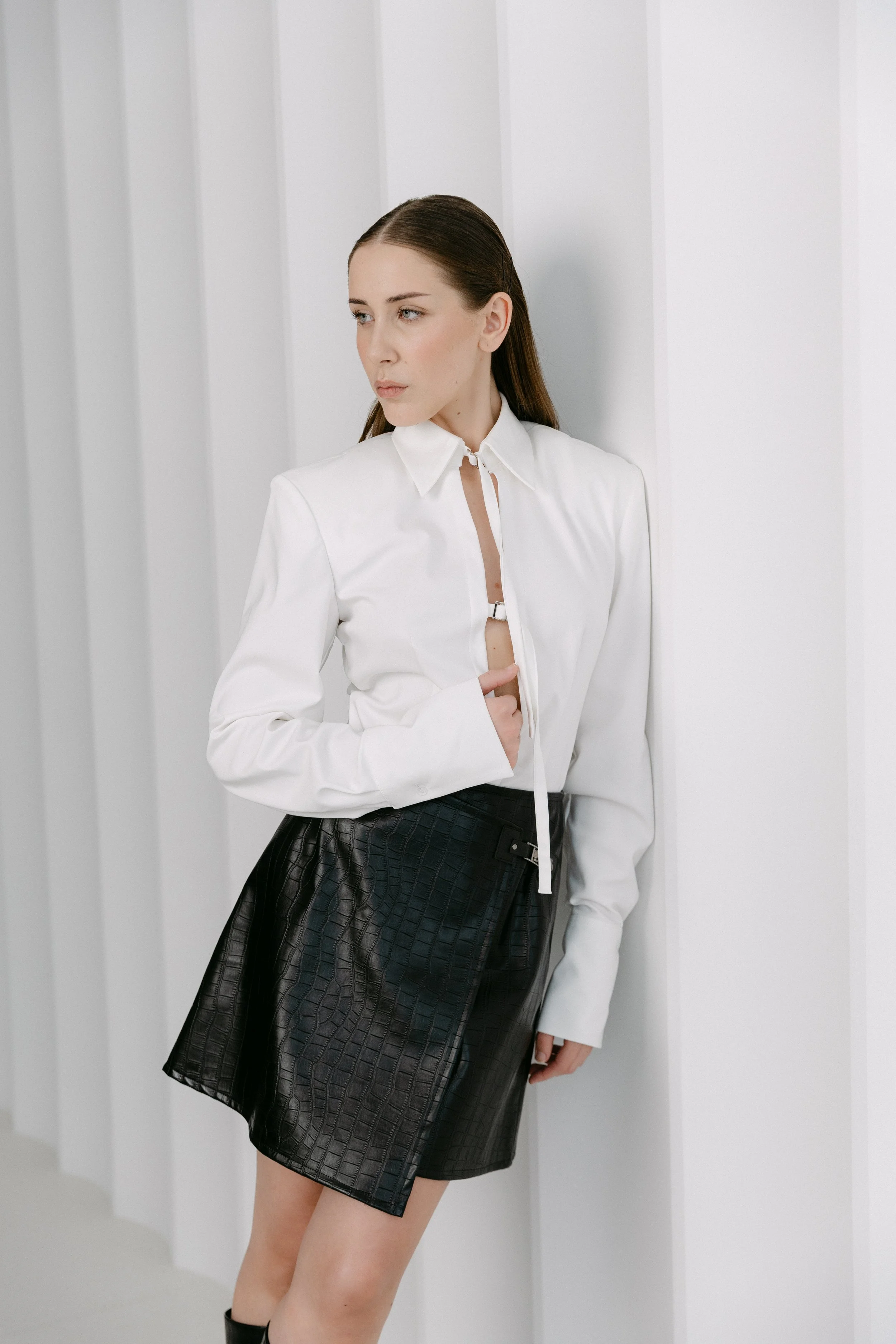 Structured white suit €450.00 Black feather-trimmed suit €450.00 Wool-silk dress blazer €300.00 Leather blazer with structured shoulders €200.00 Black leather A-line skirt €95.00 Structured cotton shirt with metal details €160.00 Wool-silk corset with silver imitation buttons €180.00 Pleated skirt with belt detail €110.00 White draped top €95.00 Oversized white shirt €140.00 Elegant long sleeve top with padded shoulders €160.00 Oversized cashmere-wool blazer €350.00 Polo t-shirt with padded shoulders in black €80.00 Sculpted denim jacket in brown €200.00 Sculpted-shoulder open-back bodysuit in black €80.00 Asymmetric shirt dress €250.00 Denim jacket in black with contrasting leather collar €200.00 A line denim skirt in brown €90.00 Leather shorts in black €130.00 Hand-knitted mohair cardigan €250.00 Hand knitted open-back mohair-silk sweater €250.00 Tote bag in black fure. €95.00 Tie in grey €30.00