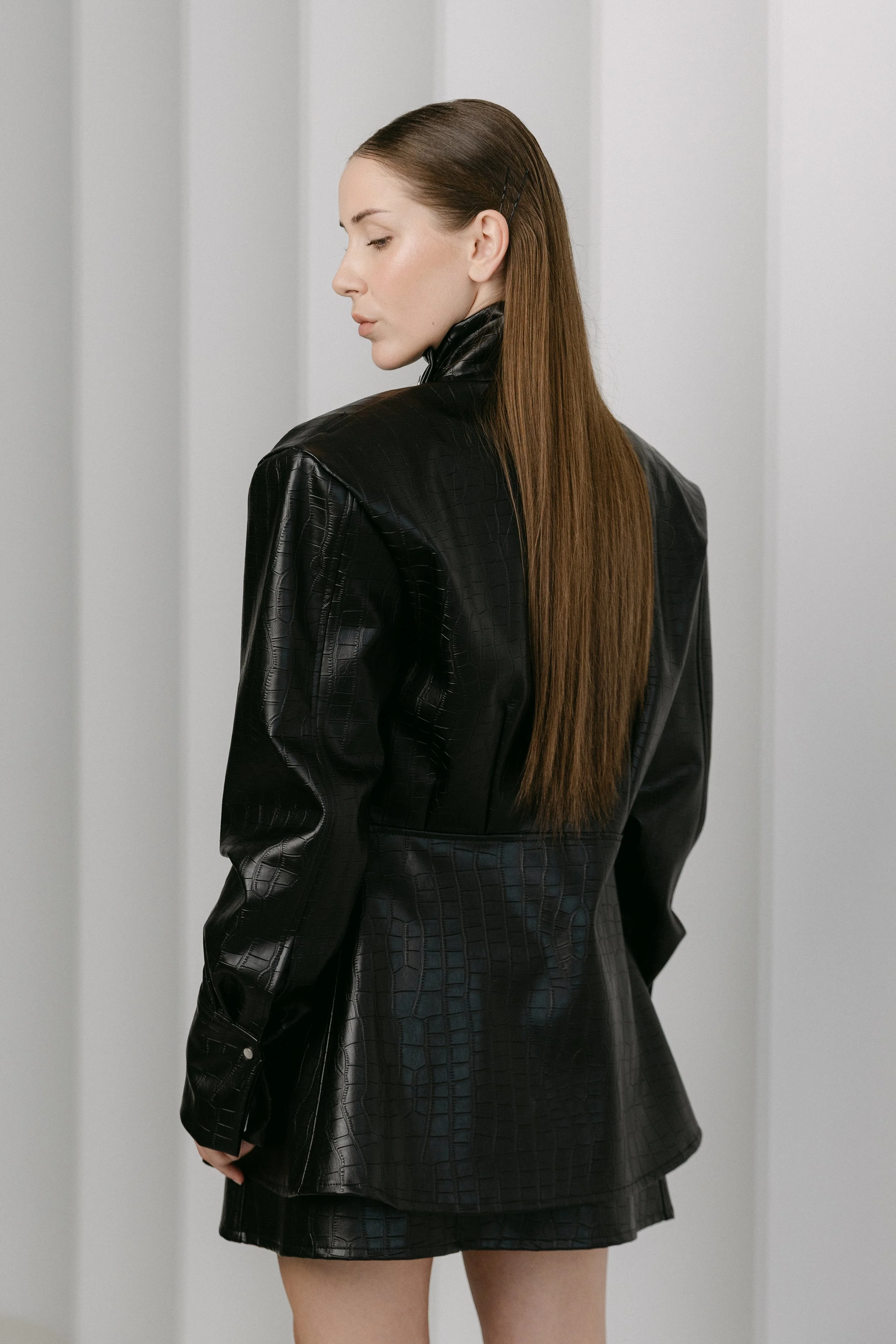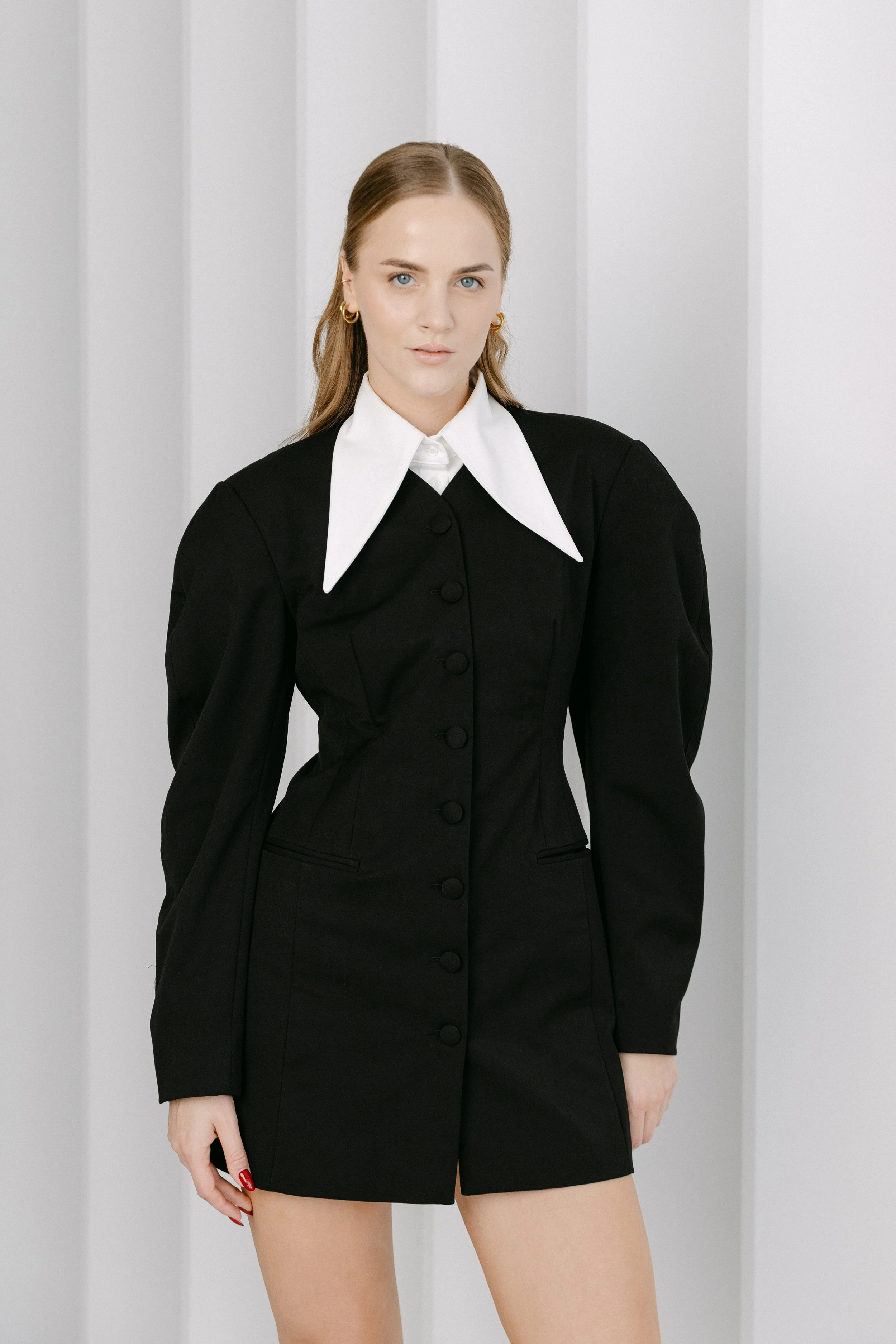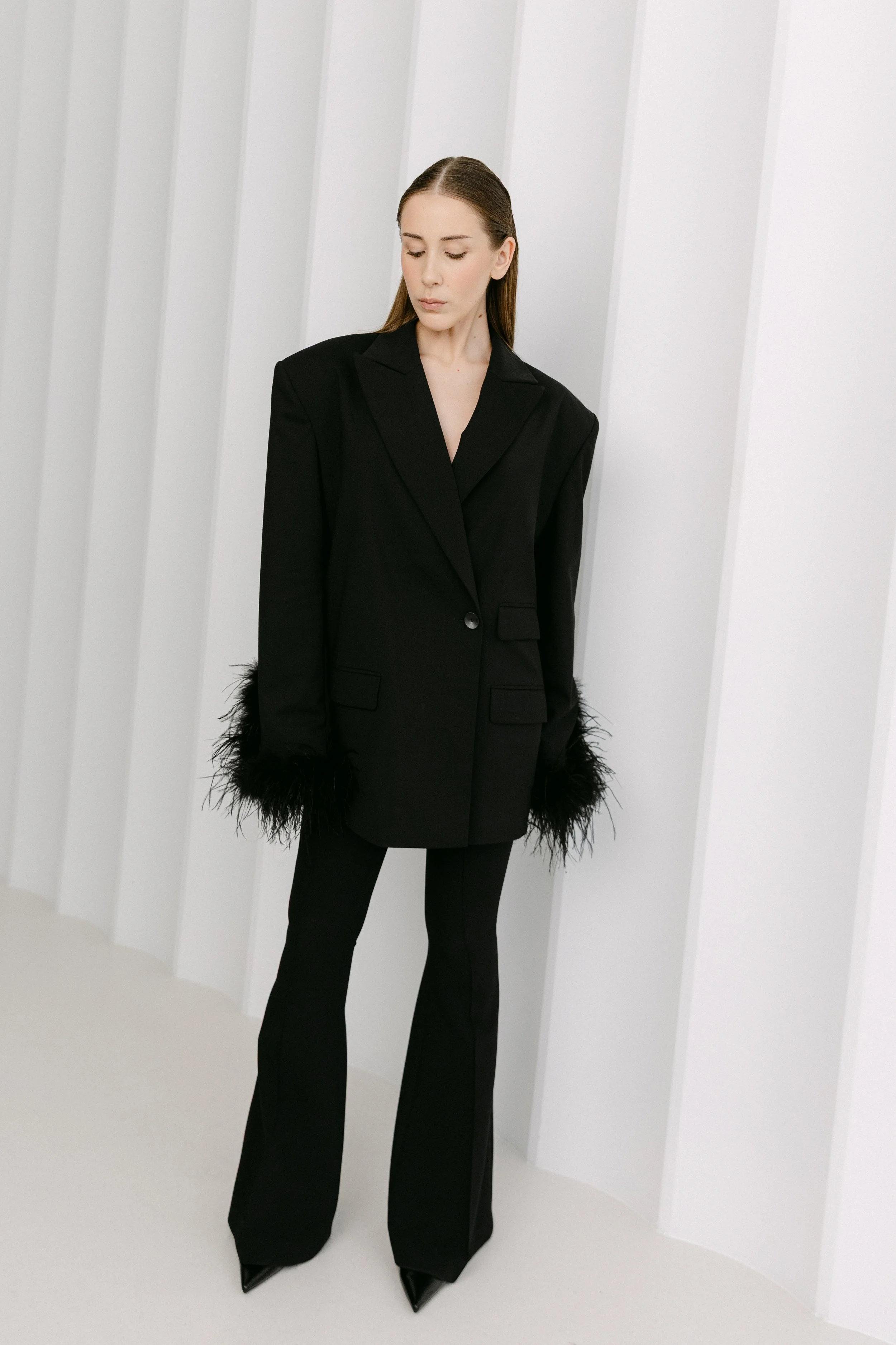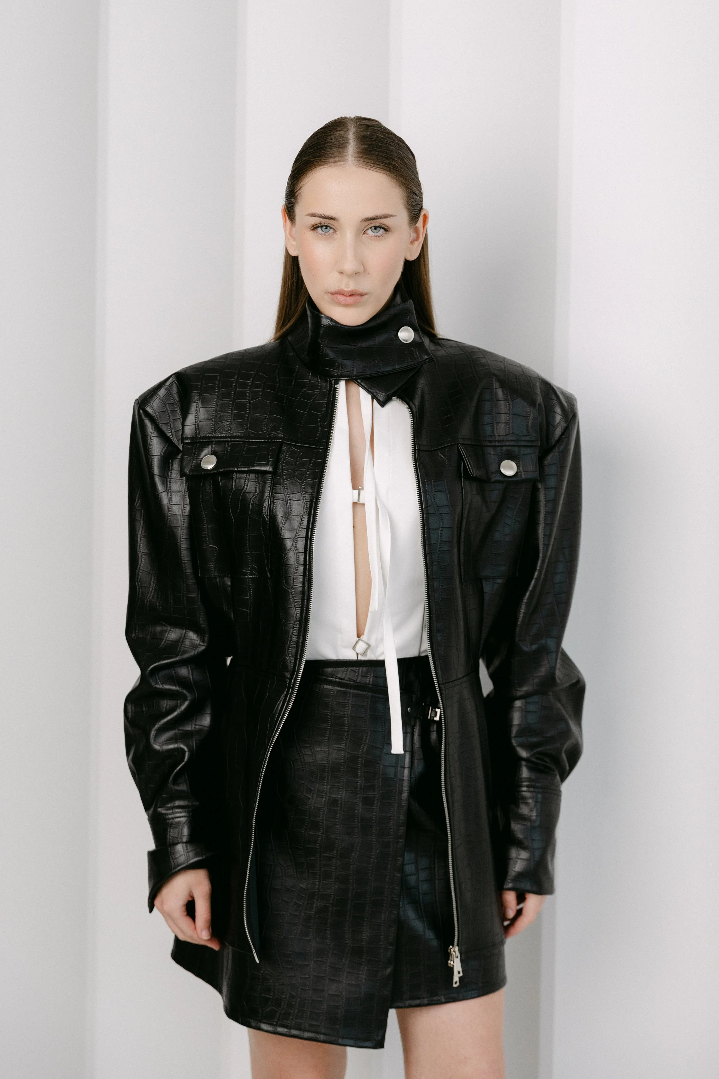 Structured white suit €450.00 Black feather-trimmed suit €450.00 Wool-silk dress blazer €300.00 Leather blazer with structured shoulders €200.00 Black leather A-line skirt €95.00 Structured cotton shirt with metal details €160.00 Wool-silk corset with silver imitation buttons €180.00 Pleated skirt with belt detail €110.00 White draped top €95.00 Oversized white shirt €140.00 Elegant long sleeve top with padded shoulders €160.00 Oversized cashmere-wool blazer €350.00 Polo t-shirt with padded shoulders in black €80.00 Sculpted denim jacket in brown €200.00 Sculpted-shoulder open-back bodysuit in black €80.00 Asymmetric shirt dress €250.00 Denim jacket in black with contrasting leather collar €200.00 A line denim skirt in brown €90.00 Leather shorts in black €130.00 Hand-knitted mohair cardigan €250.00 Hand knitted open-back mohair-silk sweater €250.00 Tote bag in black fure. €95.00 Tie in grey €30.00