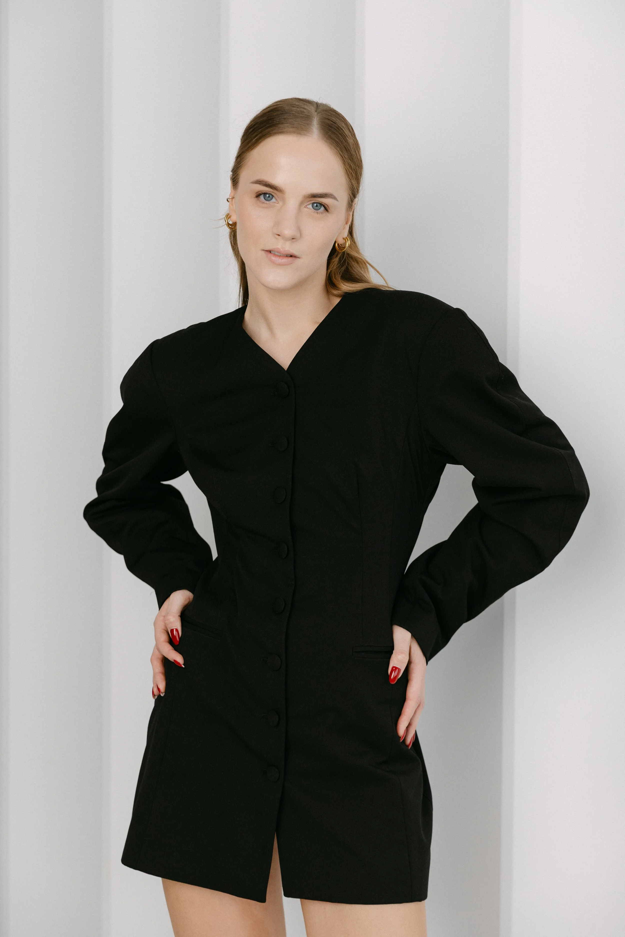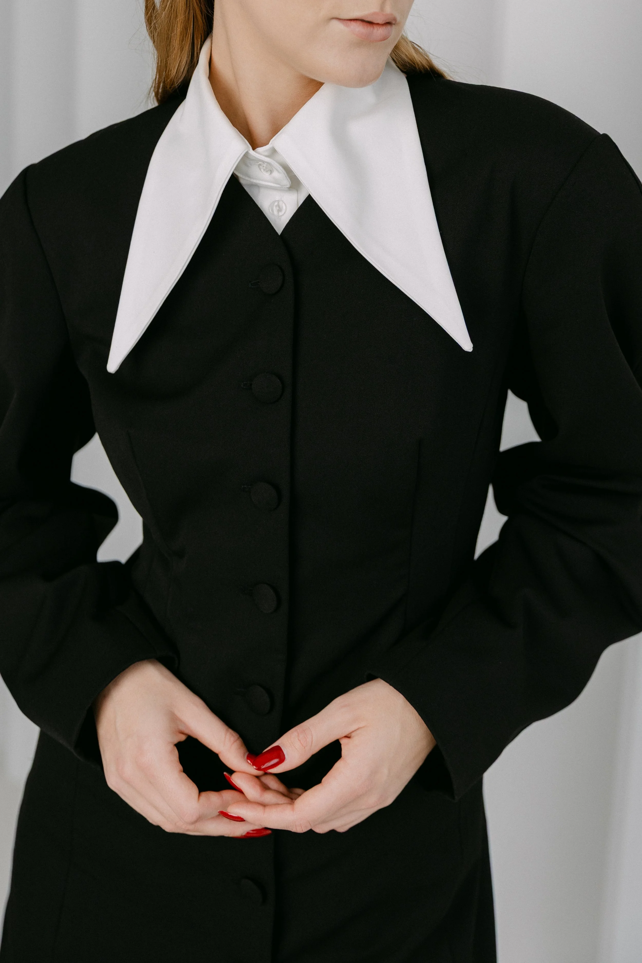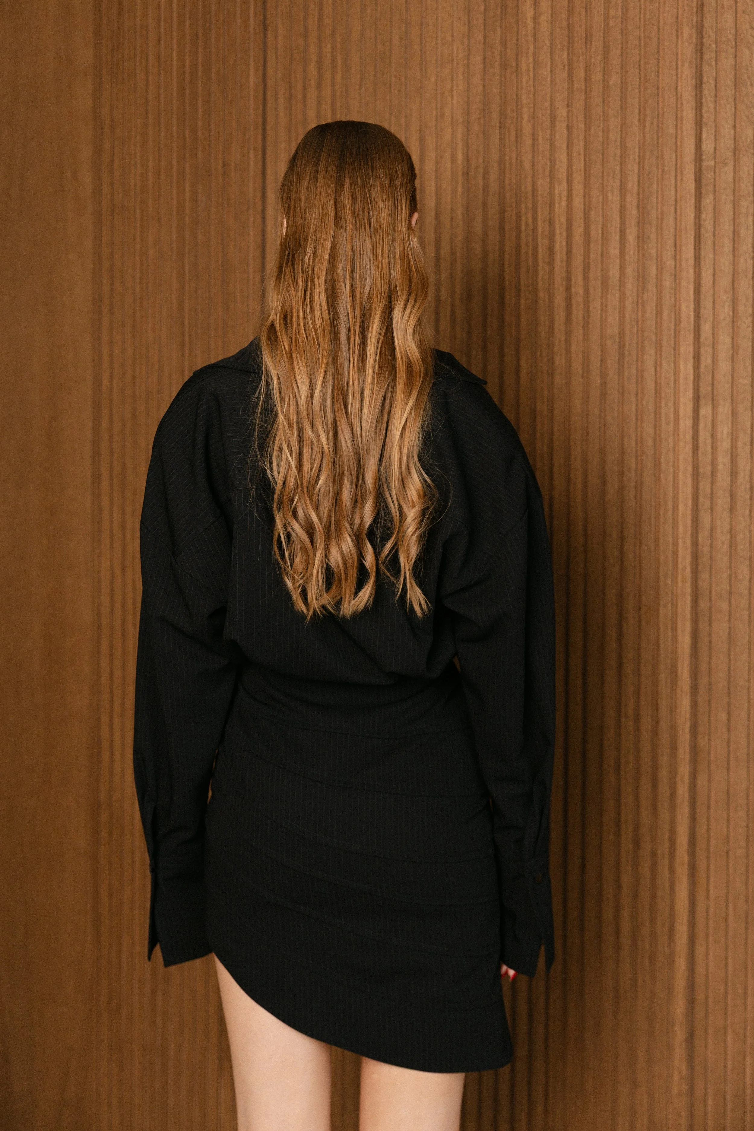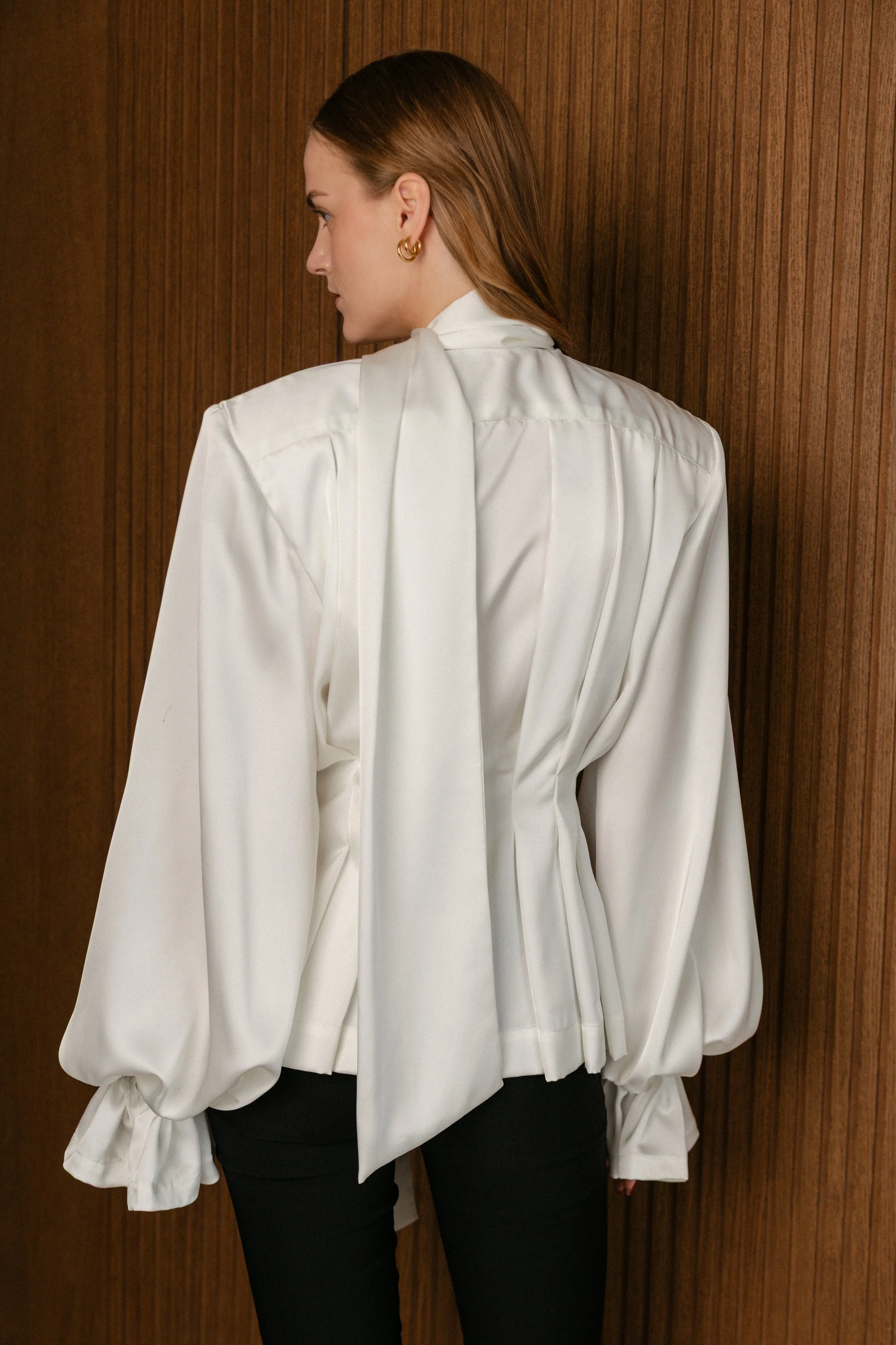 Structured white suit €450.00 Black feather-trimmed suit €450.00 Wool-silk dress blazer €300.00 Leather blazer with structured shoulders €200.00 Black leather A-line skirt €95.00 Structured cotton shirt with metal details €160.00 Wool-silk corset with silver imitation buttons €180.00 Pleated skirt with belt detail €110.00 White draped top €95.00 Oversized white shirt €140.00 Elegant long sleeve top with padded shoulders €160.00 Oversized cashmere-wool blazer €350.00 Polo t-shirt with padded shoulders in black €80.00 Sculpted denim jacket in brown €200.00 Sculpted-shoulder open-back bodysuit in black €80.00 Asymmetric shirt dress €250.00 Denim jacket in black with contrasting leather collar €200.00 A line denim skirt in brown €90.00 Leather shorts in black €130.00 Hand-knitted mohair cardigan €250.00 Hand knitted open-back mohair-silk sweater €250.00 Tote bag in black fure. €95.00 Tie in grey €30.00